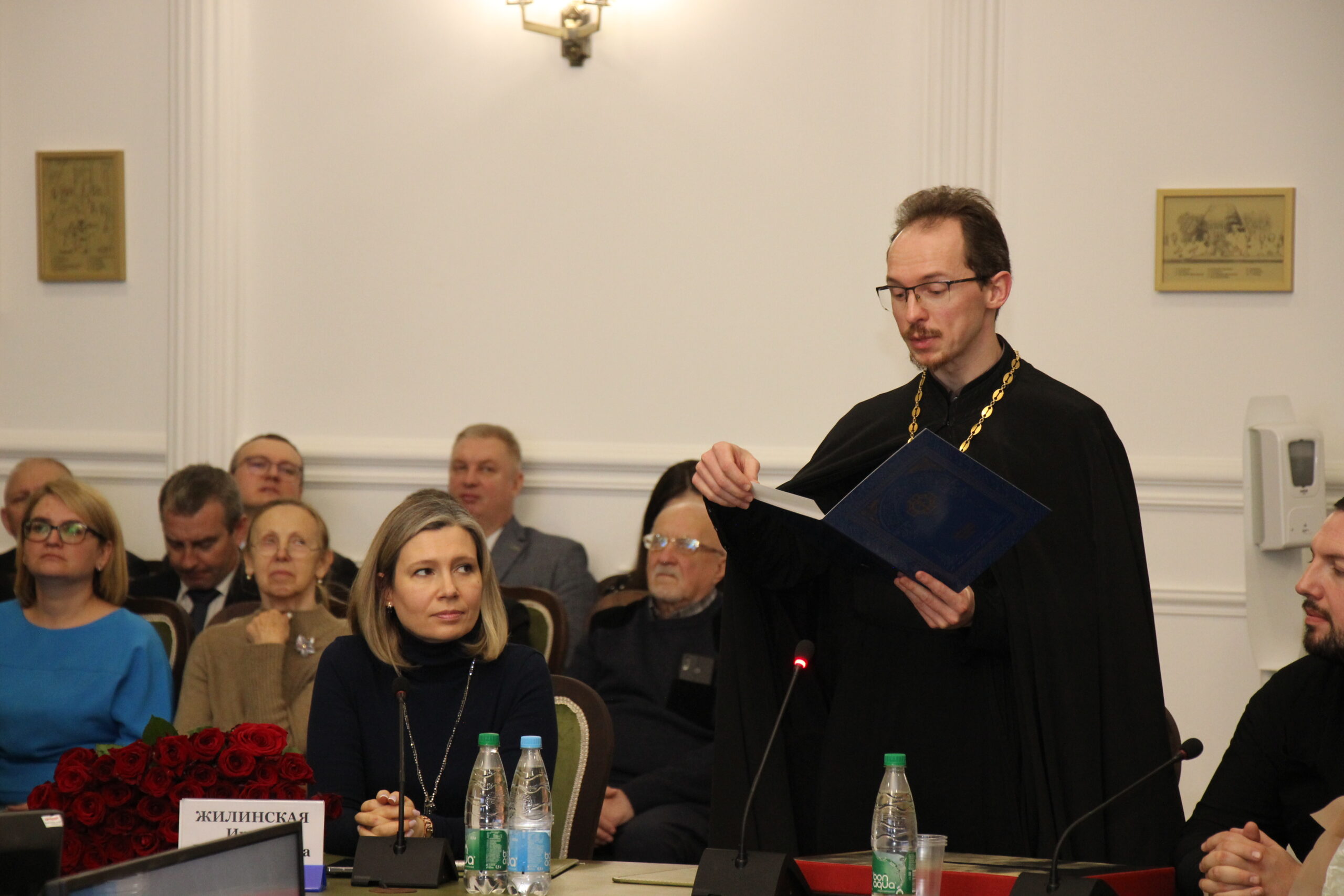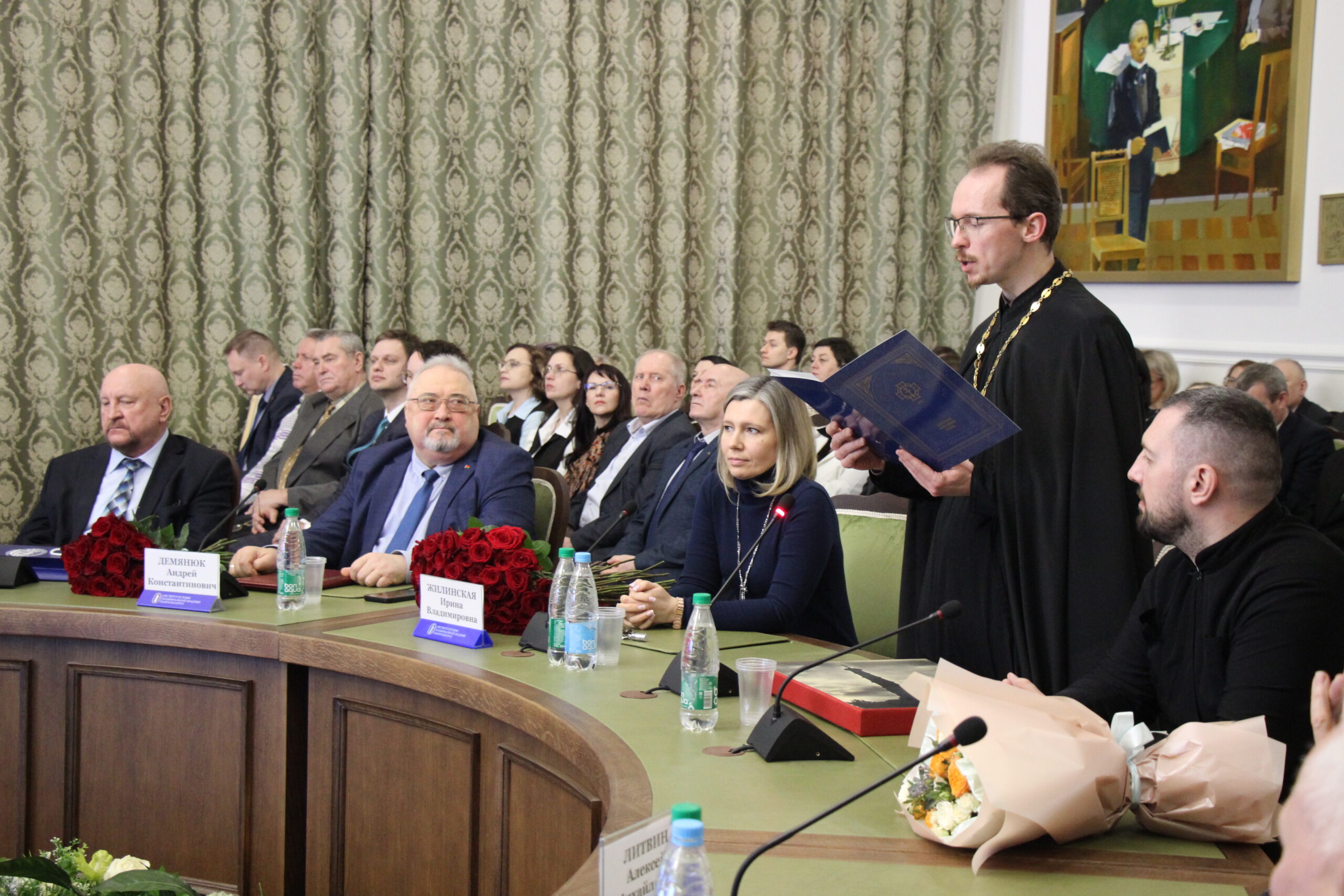 Заведующий библиотекой имени митрополита Филарета (Вахромеева) иерей Александр Волков огласил поздравительный адрес Патриаршего Экзарха, в котором владыка Вениамин отметил серьезный вклад А. А. Ковалени в развитие добрых отношений между Белорусской Православной Церковью и Национальной академией наук Беларуси.