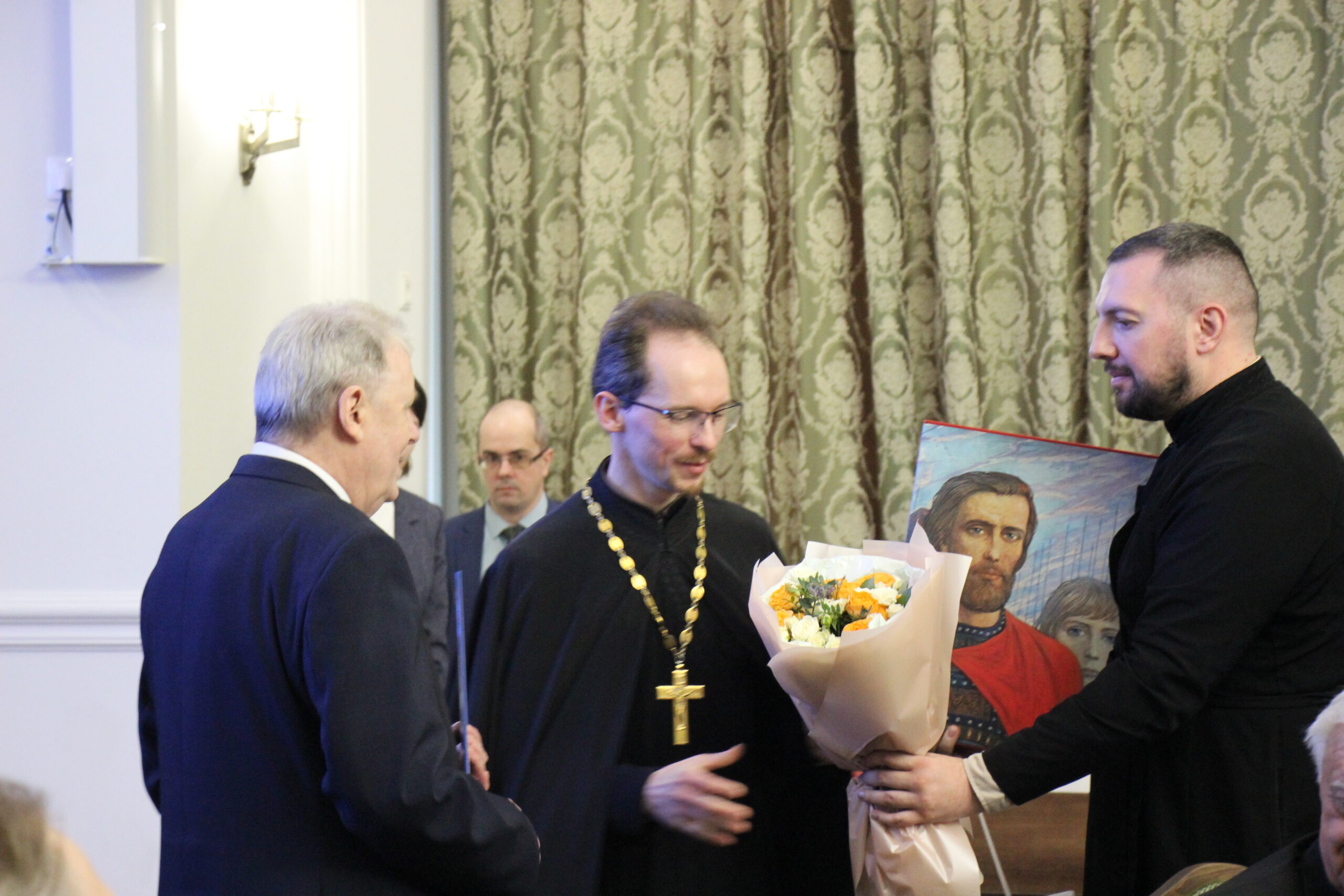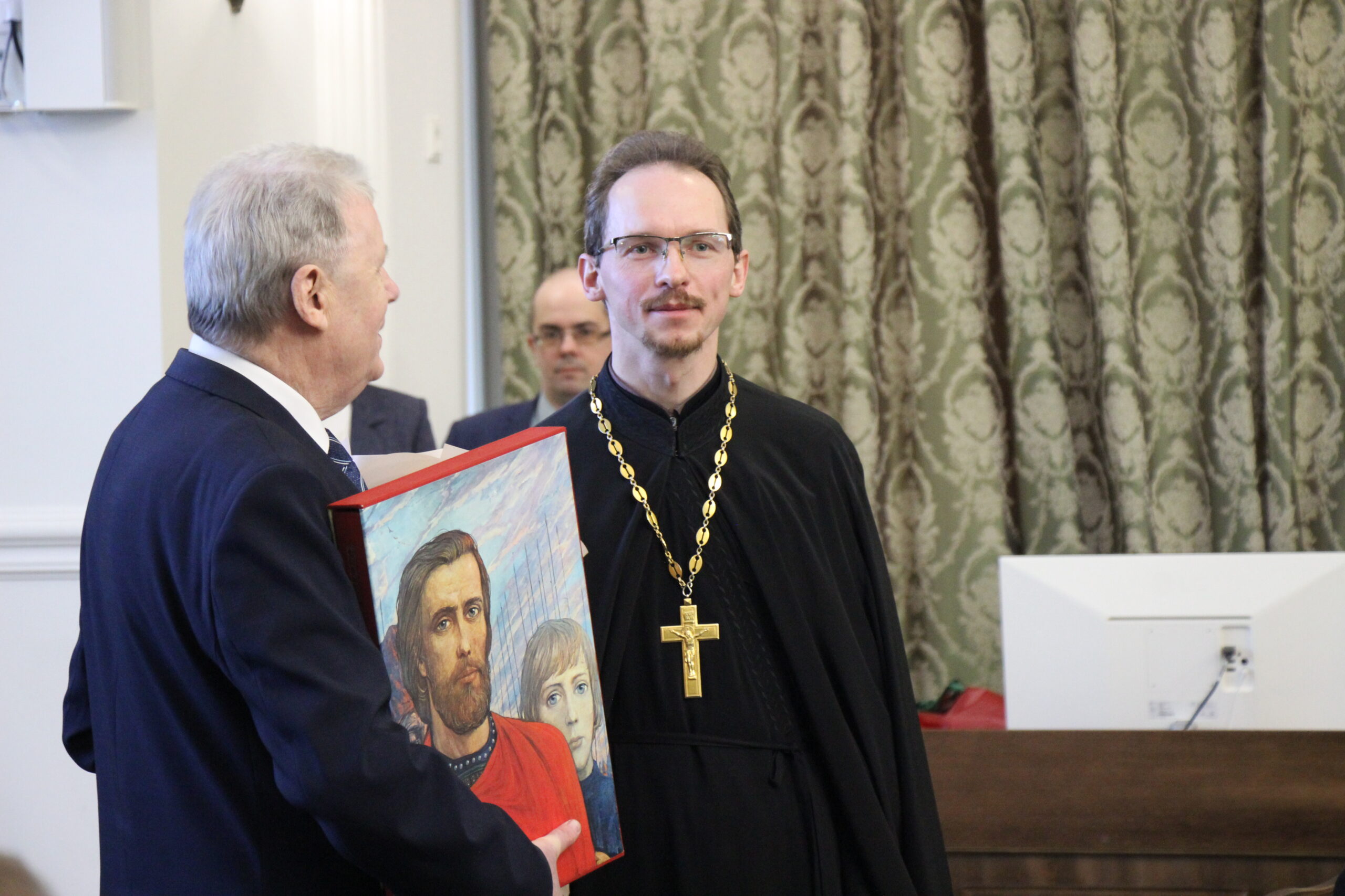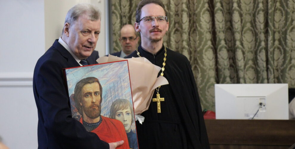 После прочтения поздравительного адреса помощник ректора Минской духовной академии Александр Александрович Овчаров вручил юбиляру памятные подарки.