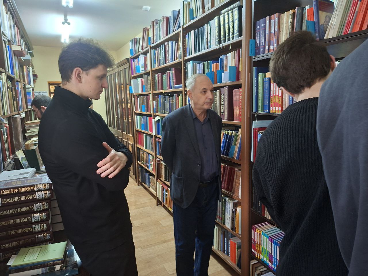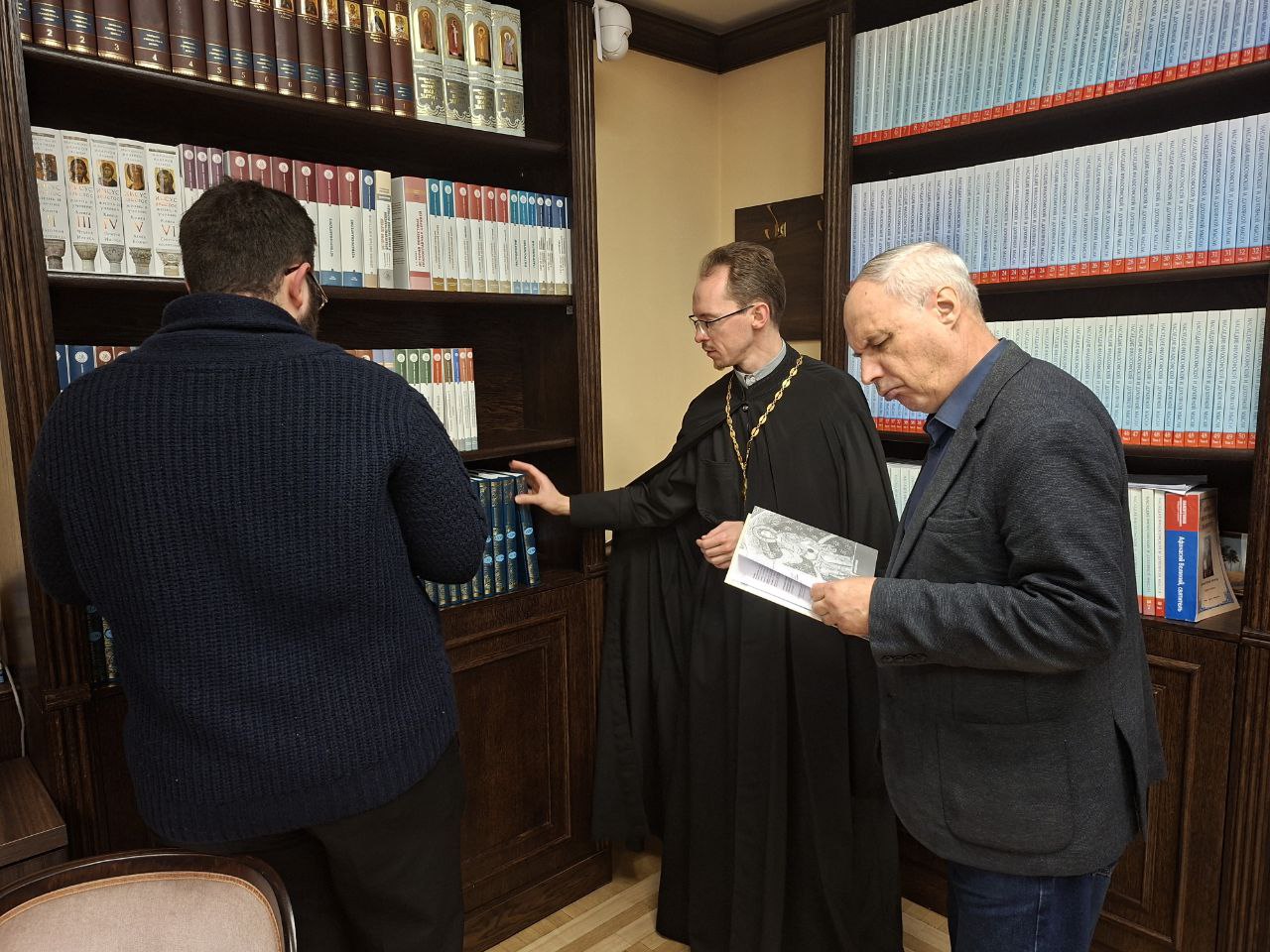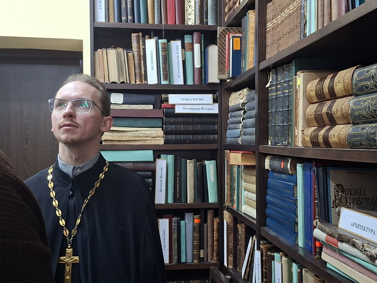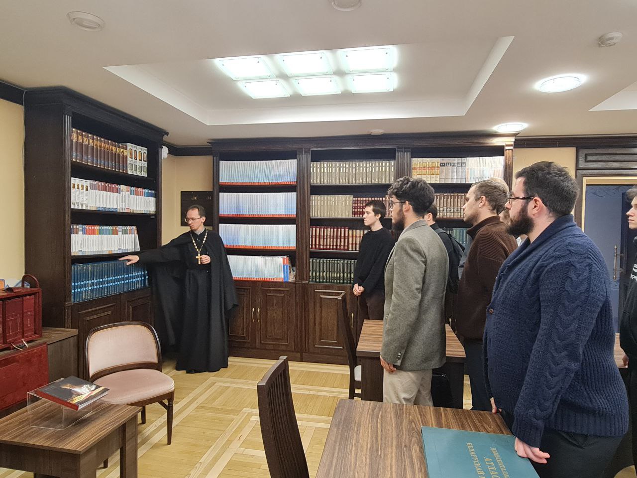 В ходе экскурсии заведующий библиотекой иерей Александр Волков рассказал об истории формирования фондов, организации библиотечно-информационной деятельности на текущем этапе, о сотрудничестве с другими библиотеками и об информационных ресурсах открытого доступа, которыми располагает библиотека.
