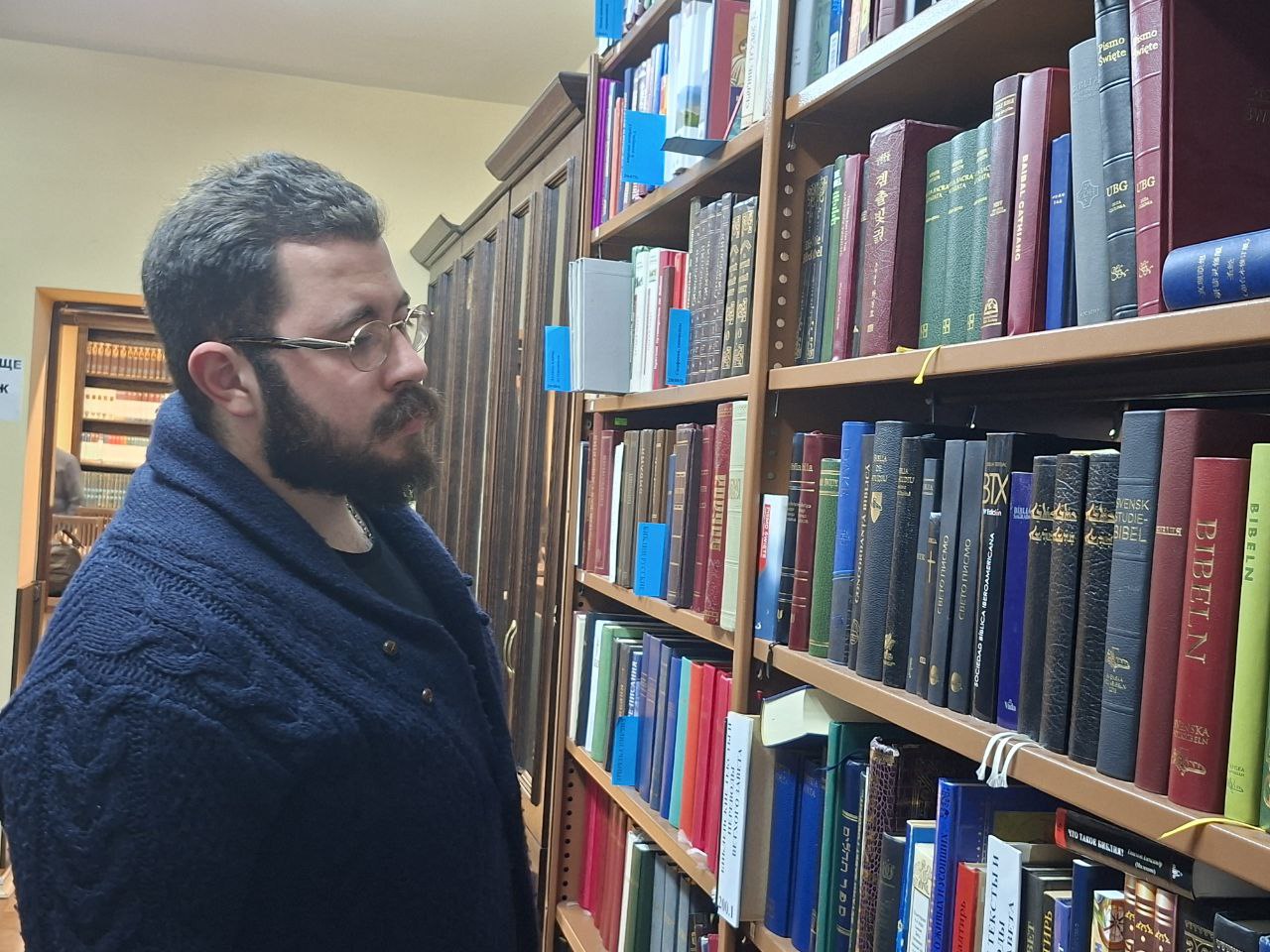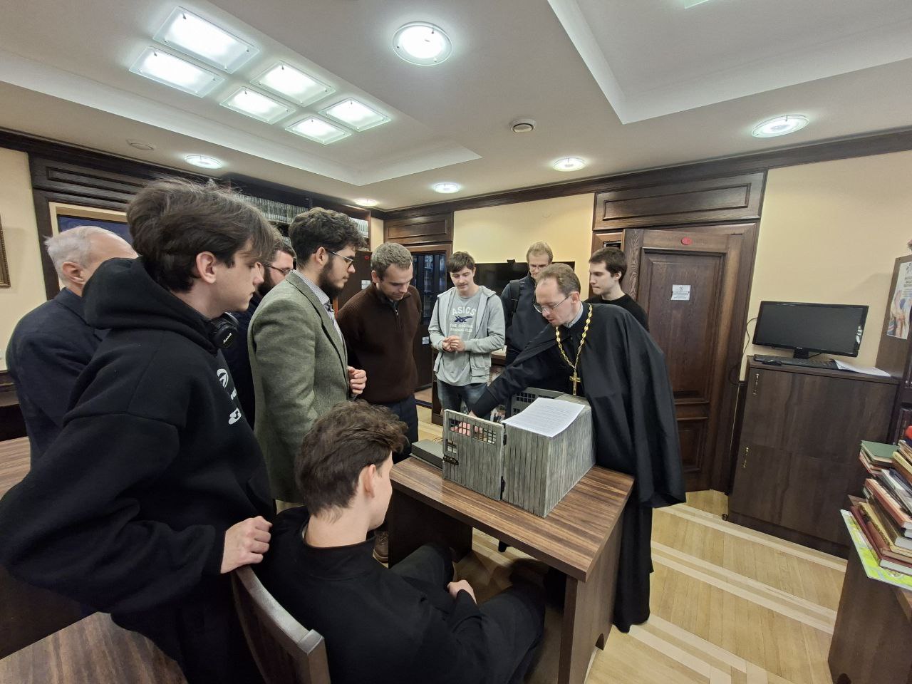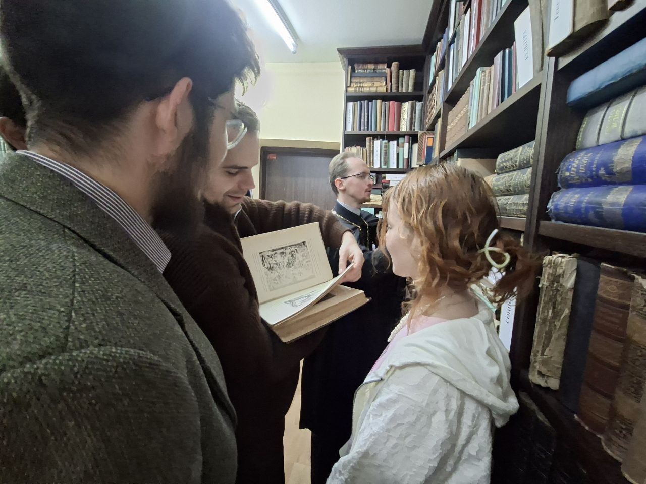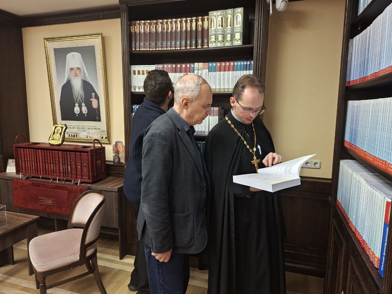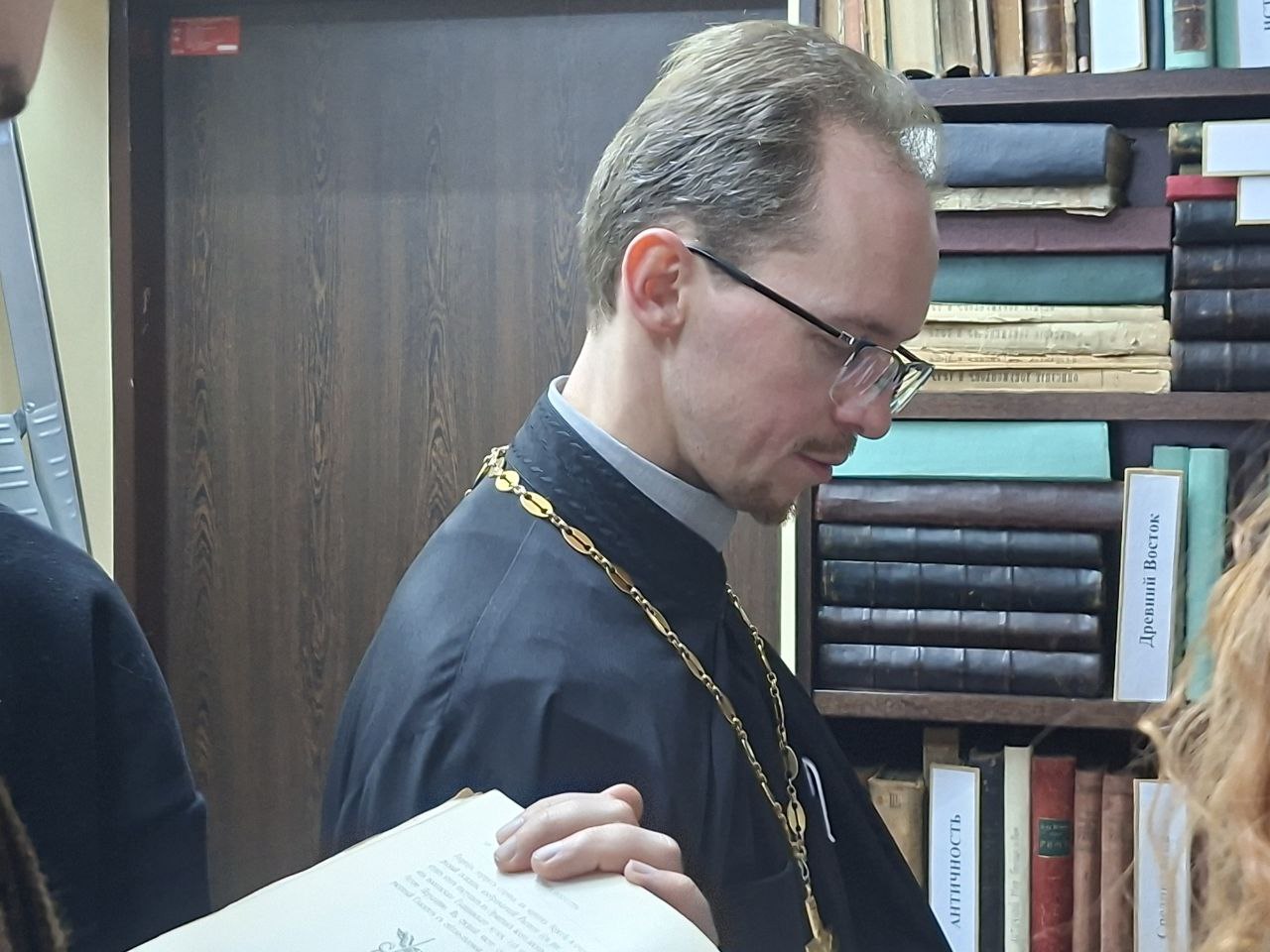 В ходе экскурсии заведующий библиотекой иерей Александр Волков рассказал об истории формирования фондов, организации библиотечно-информационной деятельности на текущем этапе, о сотрудничестве с другими библиотеками и об информационных ресурсах открытого доступа, которыми располагает библиотека.