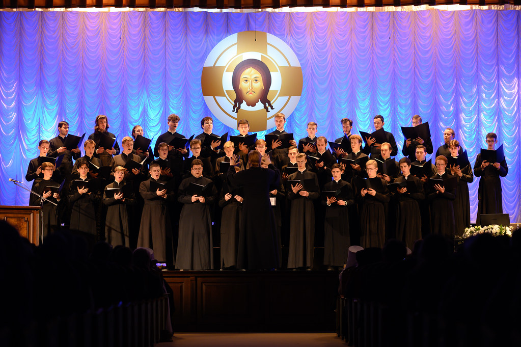 Завершился торжественный акт праздничными песнопениями, исполненными Объединенным хором Свято-Троицкой Сергиевой лавры и Московской духовной академии под управлением диакона Александра Левенцова.