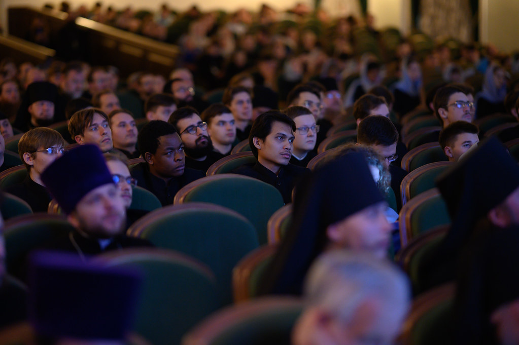 После показа видеоролика «От Покрова до Покрова», посвященного главным событиям из жизни духовной школы в 2024/2025 гг. со словами приветствия и поздравления выступил Ректор Московской духовной академии епископ Сергиево-Посадский и Дмитровский Кирилл.